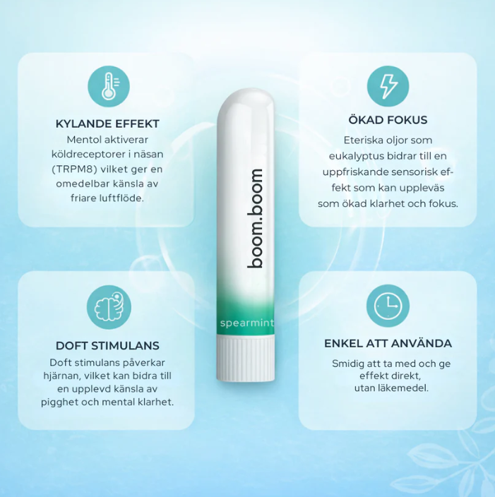 Naturliga eteriska oljor som mentol stimulerar näsans receptorer och ger en omedelbar känsla av klarare andning. Den uppfriskande effekten kan öka vakenhet och fokus – utan koffein.